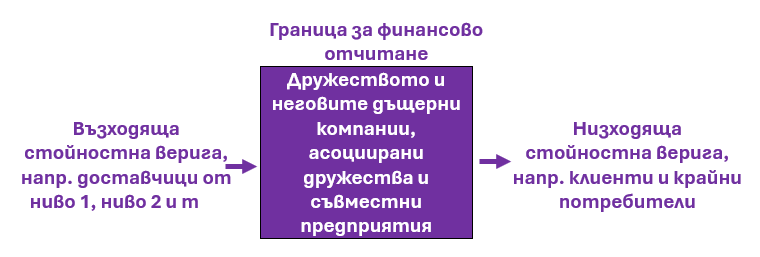 CSRD разширява границата на докладване за предприятията извън техните собствени операции, за да включи както предходните, така и дейностите след дружеството във веригата на стойността. Предприятието трябва да отчита материални въздействия, рискове и възможности във веригата на стойността съгласно оповестяванията на ESRS или, ако съществуват други материални въздействия, не обхванати от ESRS, да включи специфични за дружеството оповестявания. Това се отнася за всички равнища във веригата на стойността.