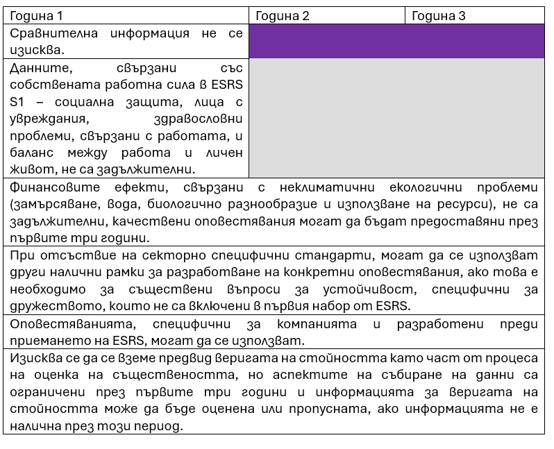 Тъй като окончателният текст на ESRS е публикуван, компаниите, които попадат в обхвата на CSRD, трябва да се подготвят, тъй като някои от отчетните субекти ще трябва да прилагат ESRS за отчетни периоди, започващи на или след 1 януари 2024 г.