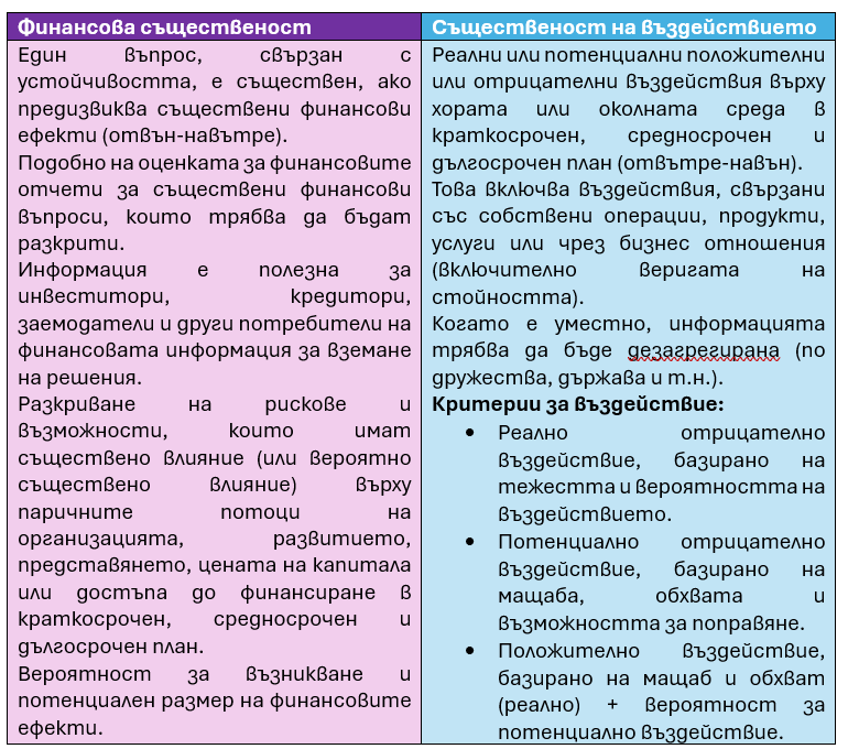 CSRD и ESRS въвеждат концепцията за двойна същественост. Дружествата, прилагащи ESRS, трябва да отчитат значимите въздействия, рискове и възможности или „IROs“ във всяка тематична област в своите отчети по устойчивост, които са както финансово значими (вън навътре), така и влияят на хората и околната среда (вътре навън).