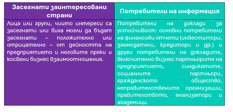 В рамките на ESRS, заинтересованите страни се определят както като потребители на доклади за устойчивост, така и като други заинтересовани страни или потребители на информация. Заинтересованите страни са тези, които могат да повлияят на организацията или да бъдат повлияни от нея, и двете групи трябва да бъдат включени в процеса на надлежна проверка.