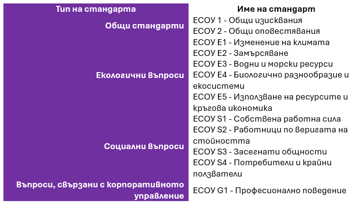 Първият набор от ESRS включва два общи и десет тематични стандарта в трите области на ESG, както е посочено по-долу: